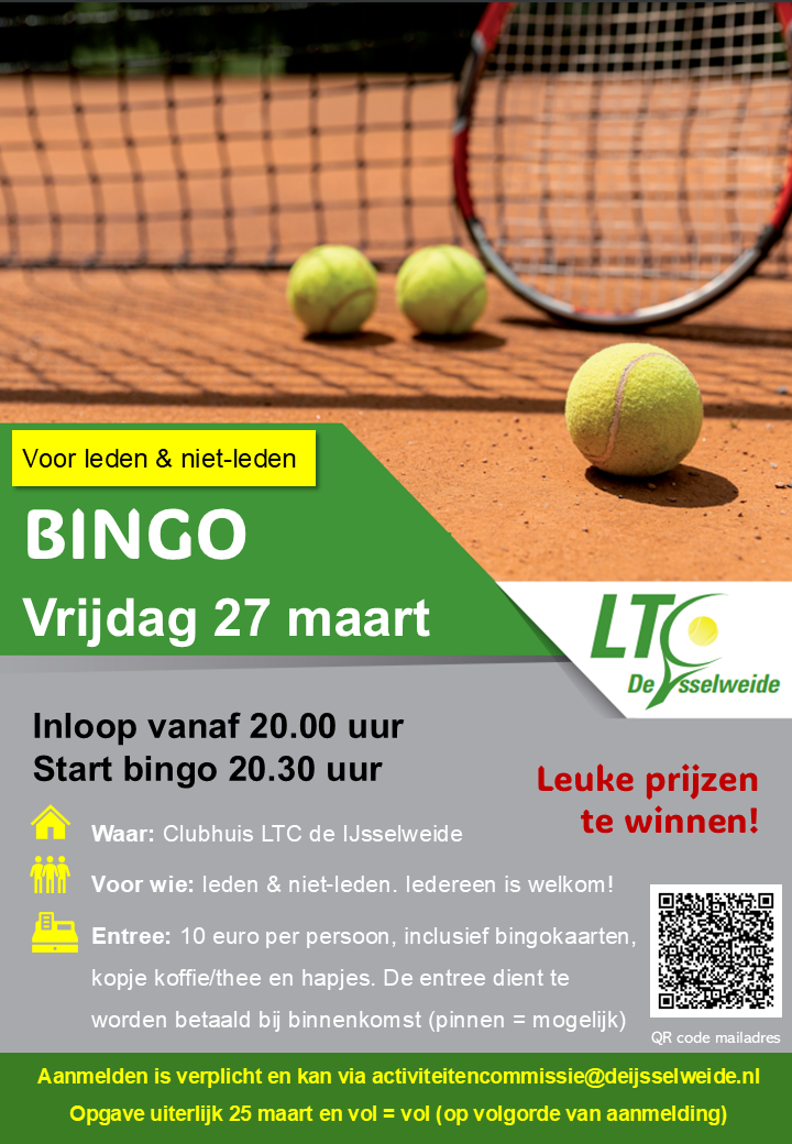 Heb jij zin in een gezellige avond vol spanning, plezier en mooie prijzen? đ Dan nodigen we je van harte uit voor onze jaarlijkse Bingoavond in het clubhuis van LTC De IJsselweide!